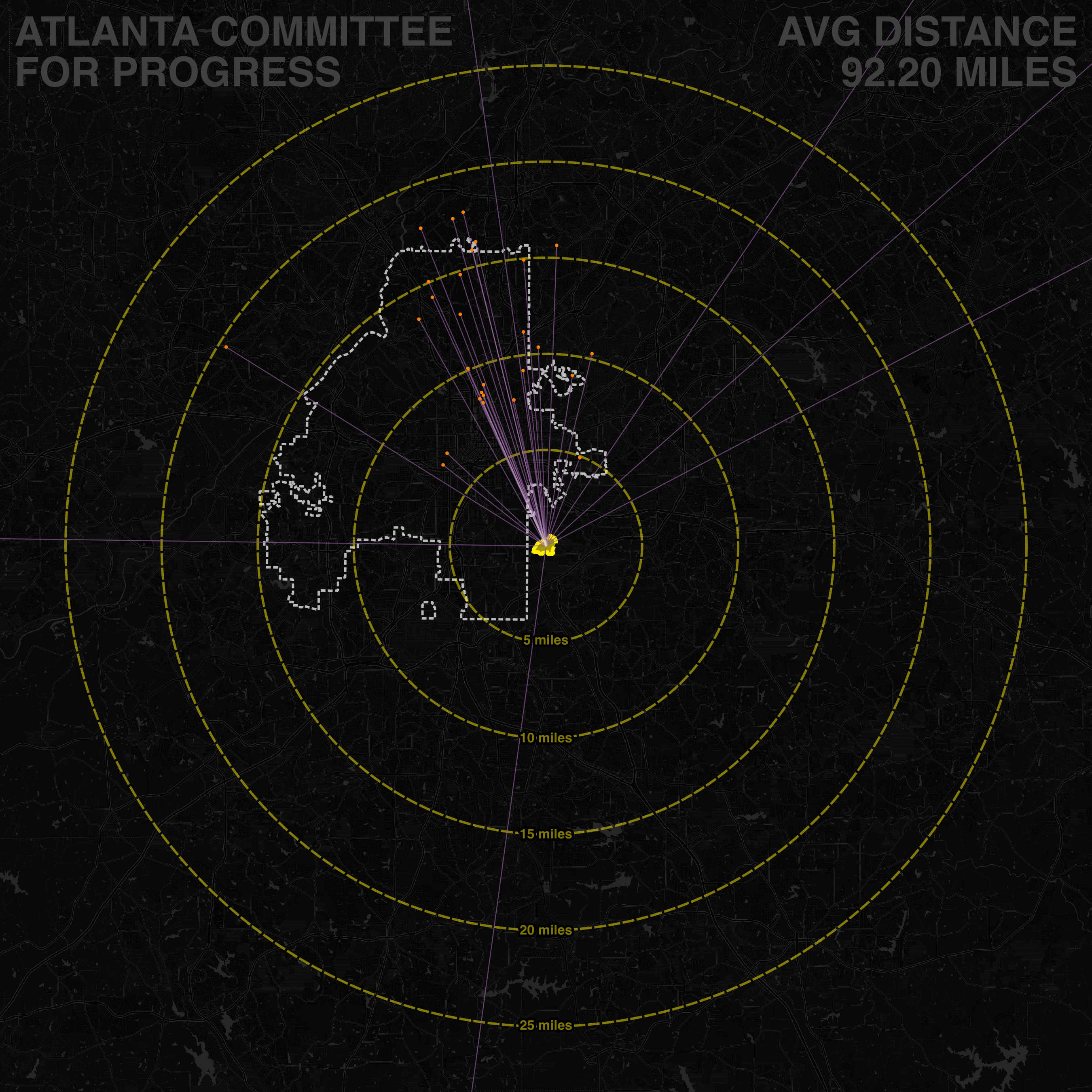 One particularly salient example of such an outsider is Dave Wilkinson, the executive director of the Atlanta Police Foundation and arguably the primary individual driver behind Cop City, who lives basically a full hour outside the city in southern Fayette County. Wilkinson is hardly an outlier though, as the average individual in our dataset lives 25 miles away from proposed site, with the average distance for the Atlanta Committee for Progress being over 90 miles due to the number of non-local business representatives who sit on the board.