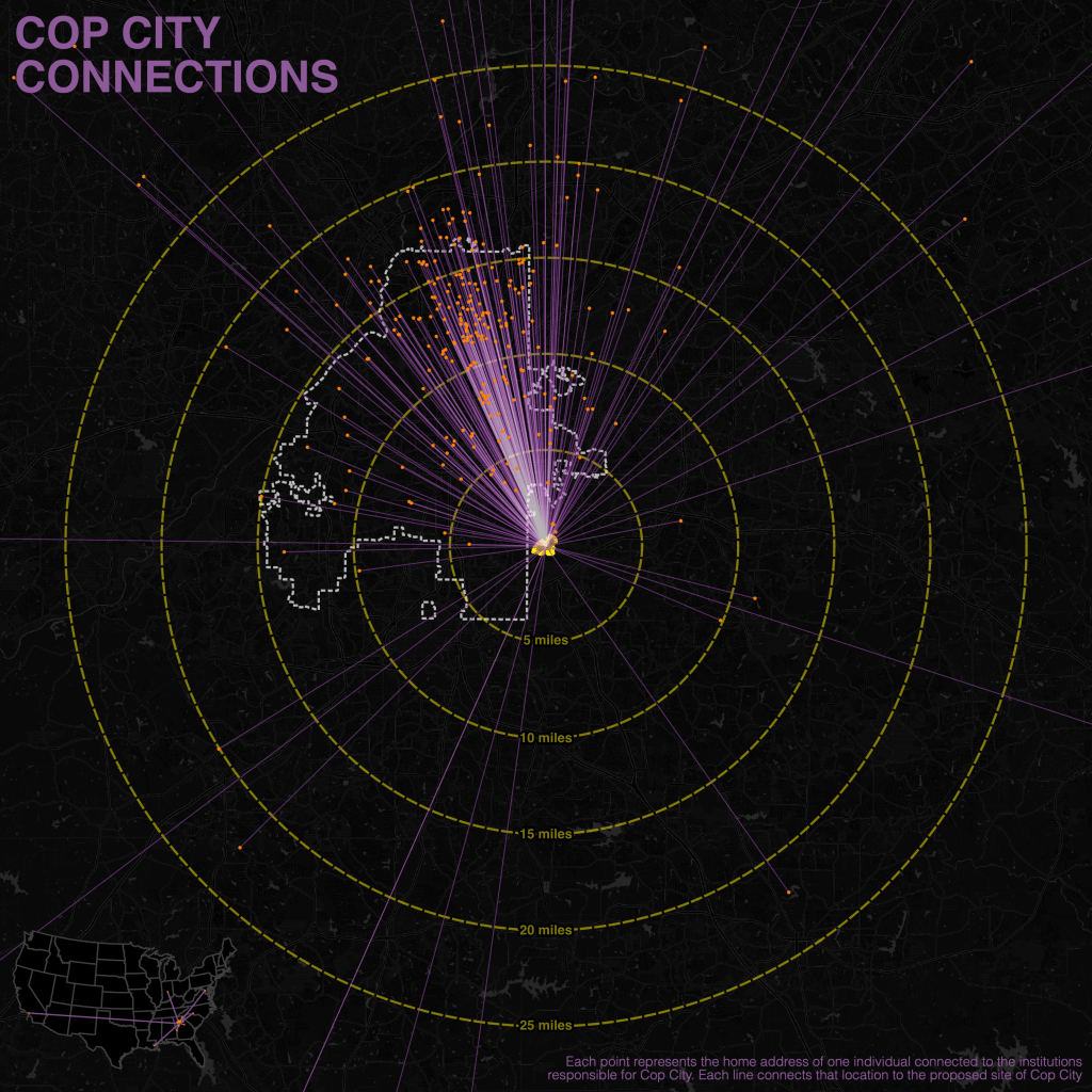 Considerable ink has been spilled dissecting “The Atlanta Way”, the name given to the practices of the city’s multiracial power structure that emerged in the mid-20th century. We’ve known that this power structure exists and how it operates. But it’s important to recognize that this power structure also has a spatial structure. It doesn’t take much to know that Buckhead runs the show around here, but these maps show that Atlanta’s power structure isn’t just based in what Dan Immergluck has called the city’s “favored northern quarter”. Indeed, a good portion of that power structure lies outside the city itself, stretching across the Atlanta metro, the state of Georgia and even further afield, accommodating regional, national, and global capital as much as its local counterparts. And yet these individuals and institutions choose to use that power to push more militarized police as the solution to practically every social problem, against the wishes of regular Atlanta residents.
